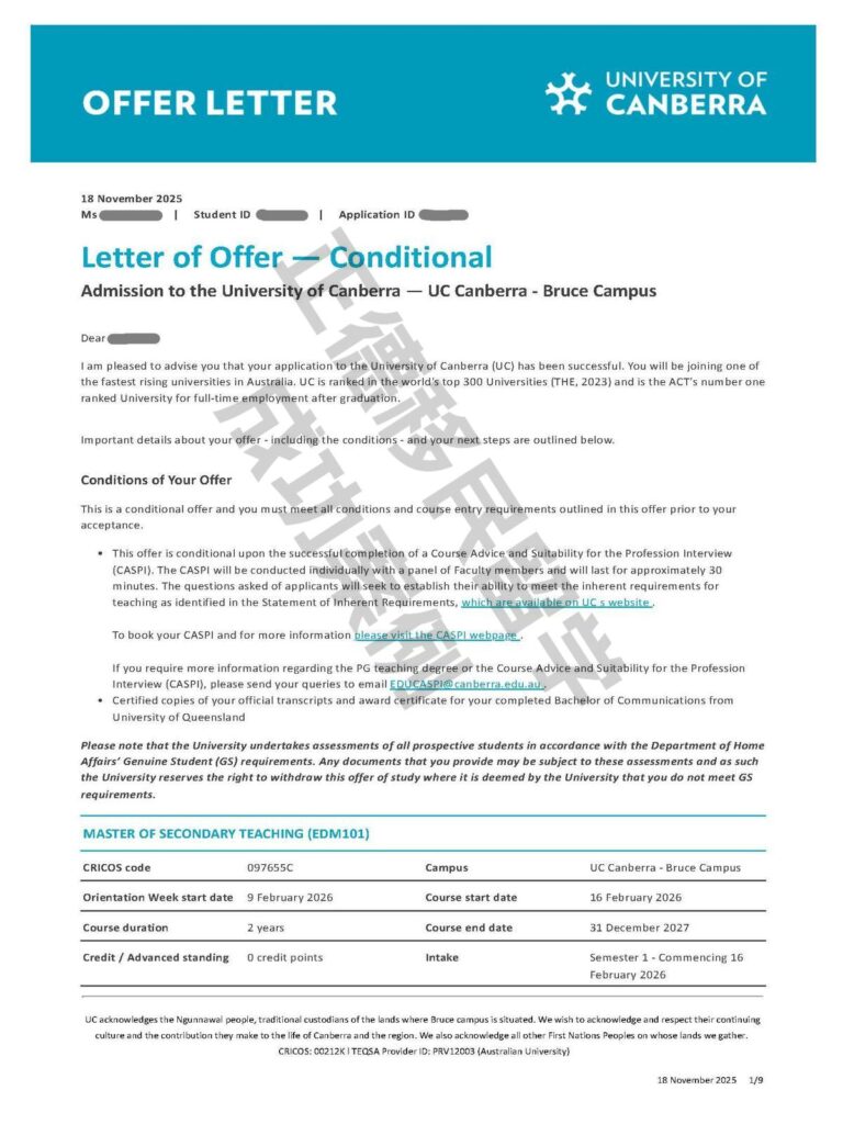 经过千辛万苦,终于拿到了属于自己的中教offer。堪培拉大学,明年2月入学。